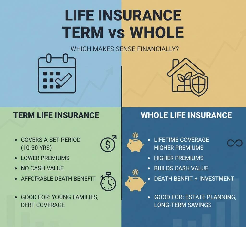 One of the most significant financial decisions in long-term financial planning is to choose between life insurance term and whole: which one makes sense? The correct decision would save your family, uphold wealth, and enhance future aspirations. The misfit is capable of sucking your budget several decades and doing so unnoticed. This manual simplifies all of this without using any jargon and makes sense in real life and thus does get you to make a decision.